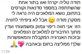 רויטל צנגאוקר: אני עברתי את החניכות של המלאכים אצל טליה ויכולה לומר שזו פשוט חוויה עוצמתית. אני משתמשת בזה יום יום ומקבלת עדויות ומרגישה את המלאכים נוכחים, עוזרים ומכוונים. בהזדמנות זו רוצה לומר לך טליה שהעברת את החניכות בצורה יעילה מובנת ובמקצועיות. תודה רבה אהובה שכמוך. קורס חיבור למלאכים מאד מומלץ!