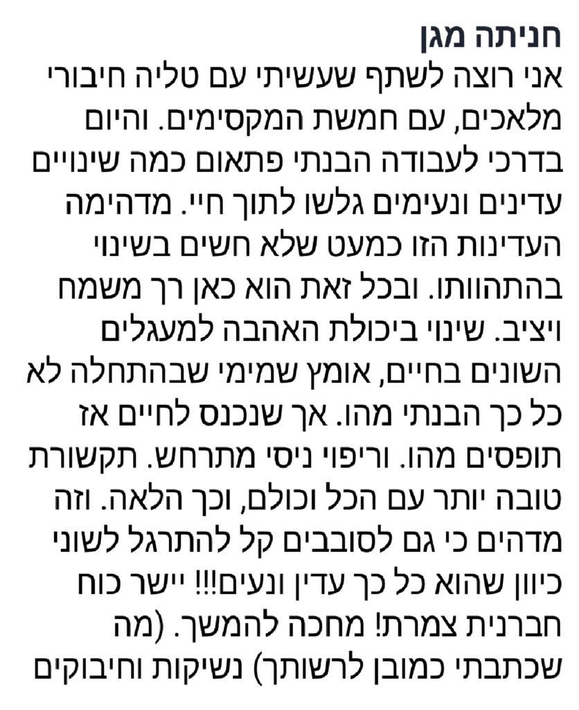 חניתה מגן: אני רוצה לשתף שעשיתי עם טליה חיבורי מלאכים עם חמש המקסימים והיום בדרכי לעבודה הבנתי פתאום כמה שינויים עדינים ונעימים גלשו לתוך חיי. מדהימה העדינות הזו שכמעט שלא חשים בשינוי בהתהוותו ובכל זאת הוא כאן, רך, משמח ויציב. שינוי ביכולת האהבה למעגלים השונים בחיים, אומץ שמימי שבהתחלה לא כל כך הבנתי מהו אך כשנכנס לחיים אז תופסים מהו, וריפוי ניסי מתרחש, תקשורת טובה יותר עם כולם וזה מדהים, כי גם לסובבים קל להתרגל לשינוי כיוון שהוא כל כך עדין ונעים!! יישר כוח! מחכה להמשך"
