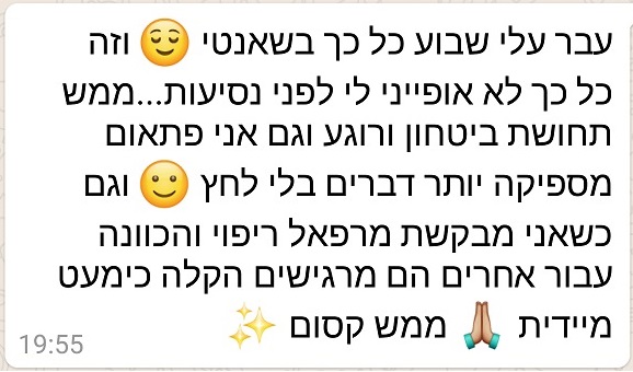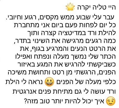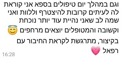 לובה: טליה יקרה, עבר עלי שבוע ממש מקסים, רגוע וחיובי. כל יום לפחות פעם ביום אני מתחברת להילת ורד במדיטציה קצרה ותוך כמה רגעים מרגישה את השינוי בתדר, את הרטט הנעים והמרגיע בגוף, את הכתר שלי נמשך מעלה ונפתח ואפילו כשביקשתי להרגיש את המגע באזור הפנים, הרגשתי מן רטט ותחושת משיכה מעלה, נראה לי הילת ורד עושה לי גם מתיחת פנים אנרגטית. איך יכול להיות טוב יותר מזה? וגם במהלך יום טיפולים אני קוראת לה לעתים קרובות להצטרף וללוות ואני שמה לב שאני נהיית עוד יותר נוכחת וקשובה והמטופלים יוצאים מרחפים. מתרגשת לקראת החיבור עם רפאל"